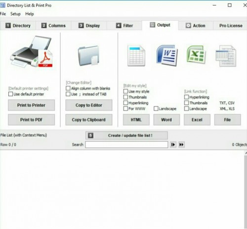 Directory List & Print is a software tool for Windows and enables listing and printing the content of any directory in a simplest way. In addition, the file lists can be formatted, filtered, saved to several file formats and also be further processed (delete/copy/move files). By copying to the clipboard the lists can be exported into other programs or opened directly in Word and Excel. The Free Version (Freeware) has all the basic features included, the Pro Version (Shareware) provides interesting additional features.